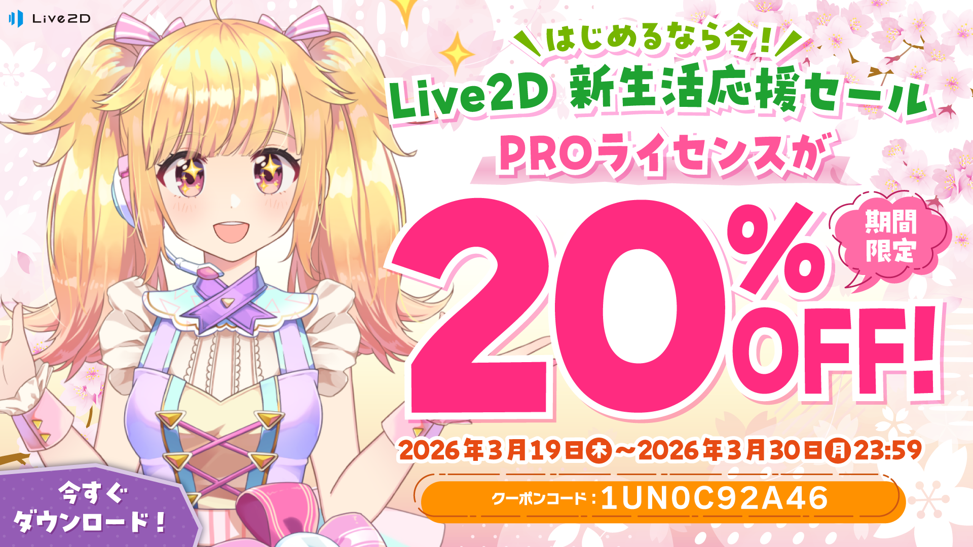 PROライセンスが20%OFF!Live2D 新生活応援セール!2026年3月30日(月)まで